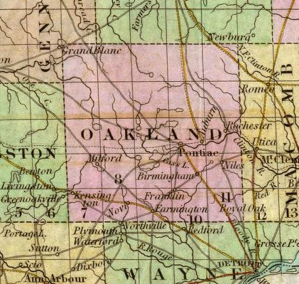 This is an enlargement of the Oakland County portion of Thomas R. Tanner's 1839 map. While the townships themselves are not named, the lines of all of Oakland County's twenty-five townships are shown, with Highland containing the "O" in the name "OAKLAND." White Lake is again visible, as are the two Indian "Paths" noted on Henry S. Tanner's 1833 map. A new feature is the dashed line running east-west through the middle of Oakland County, including the southern portion of Highland Township. This was the proposed route of the ill-fated Clinton-Kalamazoo Canal; a 216 mile waterway across the entire Lower Peninsula from Mt. Clemens, on the Clinton River, to Saugatuck, on the Kalamazoo River. Construction began at Mt. Clemens in 1838, but was beset by financial difficulties and competition from Michigan's growing railroad system. By the time the project was abandoned in 1846 only 12 miles of the canal had been completed, reaching as far as Rochester, Michigan. For more on the Clinton-Kalamazoo Canal, click here.