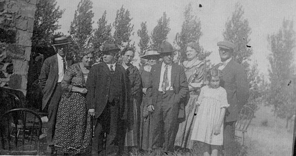 In addition to classes, the old stone school was also used for other civic and social purposes. Church services were held in the building until 1868. In later years the school also hosted class reunions like that shown here. The second on the left is Ida (Cole) Barrett standing next to her brother, Myron. The man with his hand in his pocket is Peter Cole and Myron's wife Louella is on his left.
